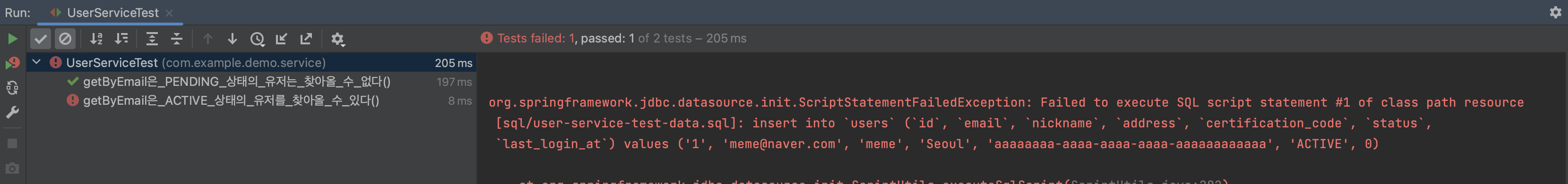 userEntity를 저장하는 코드를 다 날리고, 테스트 할 때는 미리 준비된 값을 사용하도록 수정하자. @Sql을 활용하면 된다.