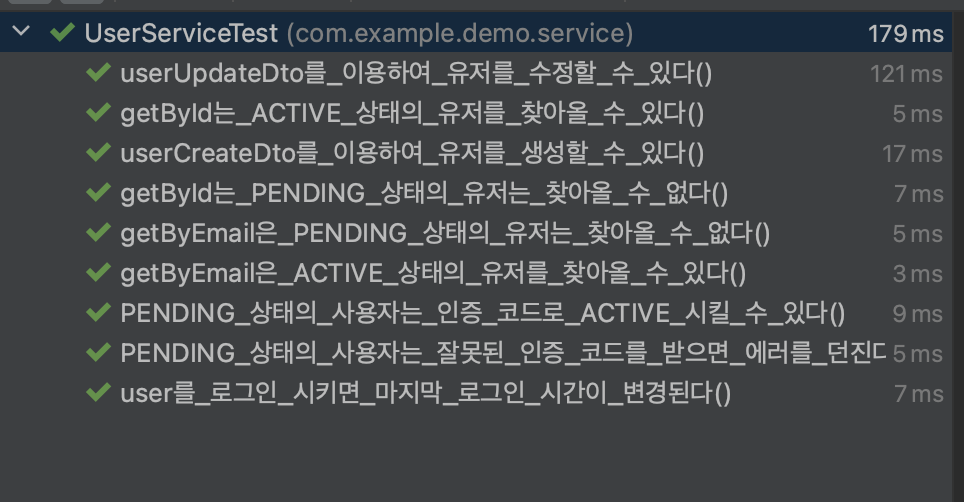 필요한 데이터를 미리 준비하고나니, 클래스 전체를 테스트해도 동시성 문제가 발생하지 않아 테스트가 성공적으로 동작한다.