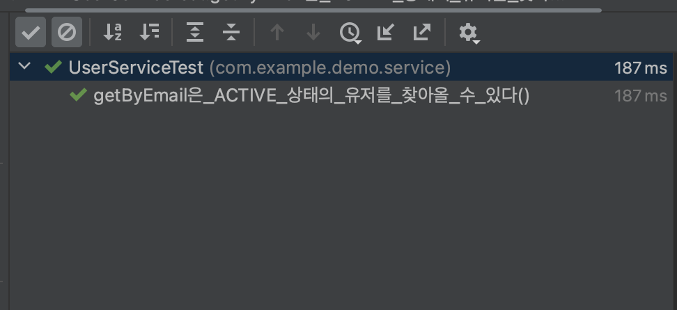 해당 메소드는 true의 결과를 기대하는데, 실행시 false를 반환해서 테스트에 실패한다.