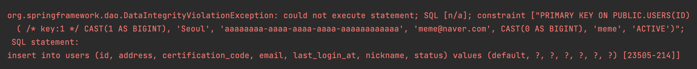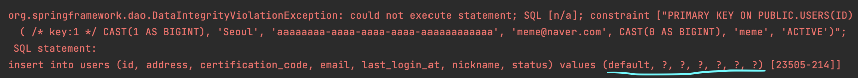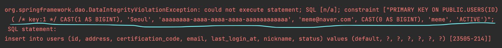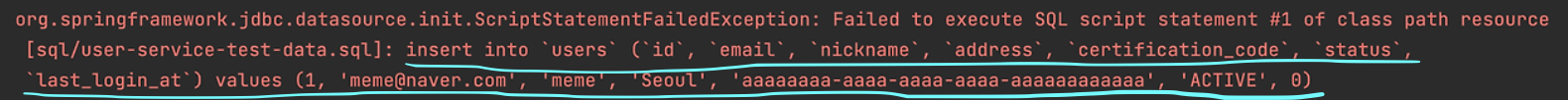 처음에 예외 로그를 보고는, 작성해둔 sql 파일의 첫 번째 쿼리인 'values (1, 'meme@naver.com', 'meme', 'Seoul', 'aaaaaaaa-aaaa-aaaa-aaaa-aaaaaaaaaaaa', 'ACTIVE', 0);'를 insert하려는 쿼리 실행에 실패한 것으로 해석했다.