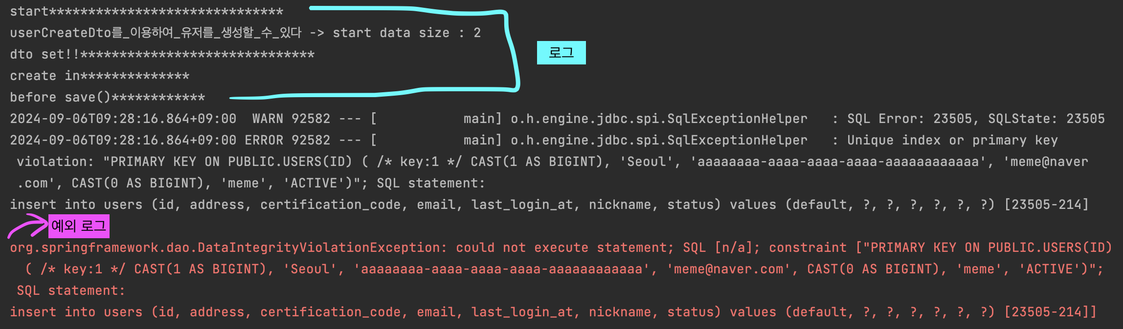 사실, 영속성 컨텍스트에서 객체를 관리하기 위해서는 무조건 PK 값이 있어야하기 때문에 원래는 트랜잭션이 끝나는 COMMIT 시점 전에 모든 쿼리가 flush된다. 그러니까 이 말대로라면, save()이후 로그가 다 출력되고 함수가 끝날 때 예외가 발생해야한다.