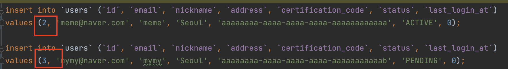 - 로그는 왜 sql 파일의 첫 번째 쿼리인 'values (1, 'meme@naver.com', 'meme', 'Seoul', 'aaaaaaaa-aaaa-aaaa-aaaa-aaaaaaaaaaaa', 'ACTIVE', 0);'와 관련하여서 찍혔을까?