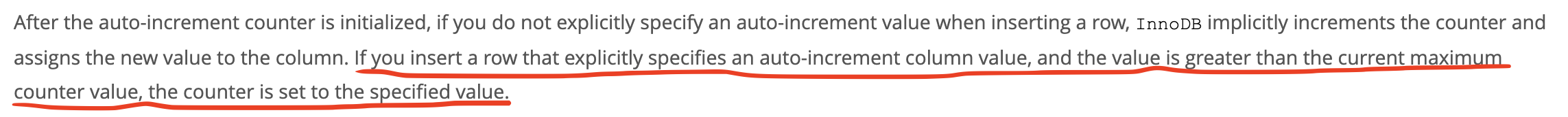 MySQL에서는 auto increment 컬럼에 특정 값을 직접 지정한 경우, 그 값이 counter값 보다 크면 counter이 업데이트 된다고 한다.